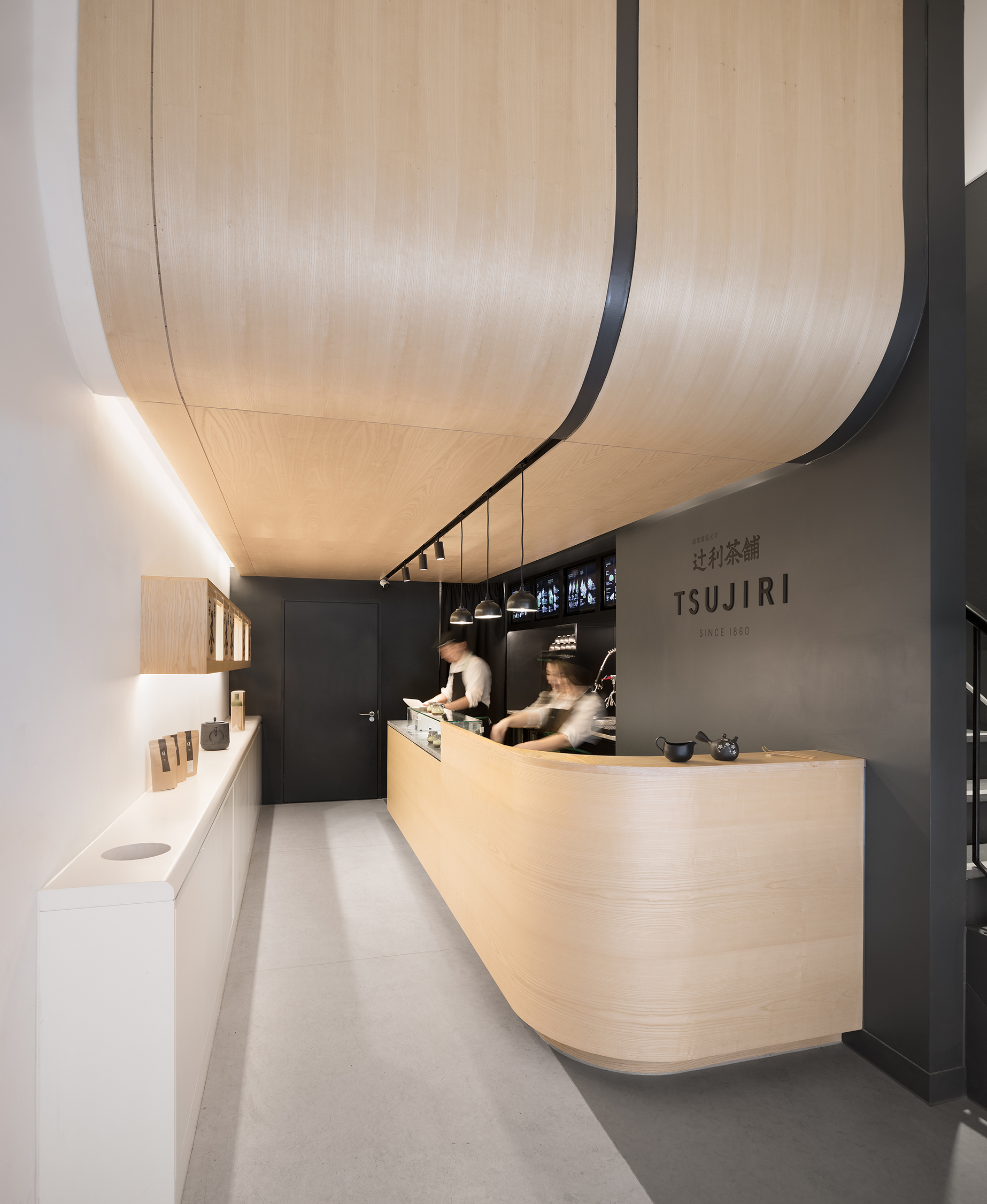 The design of Tsujiri’s new London shop aims for a sense of simplicity through the use of large uninterrupted surfaces as it draws inspiration from traditional Japanese art and architecture. Detail and intricacy come through the materiality of these surfaces as in the grains of the timber ceiling and stone countertop.