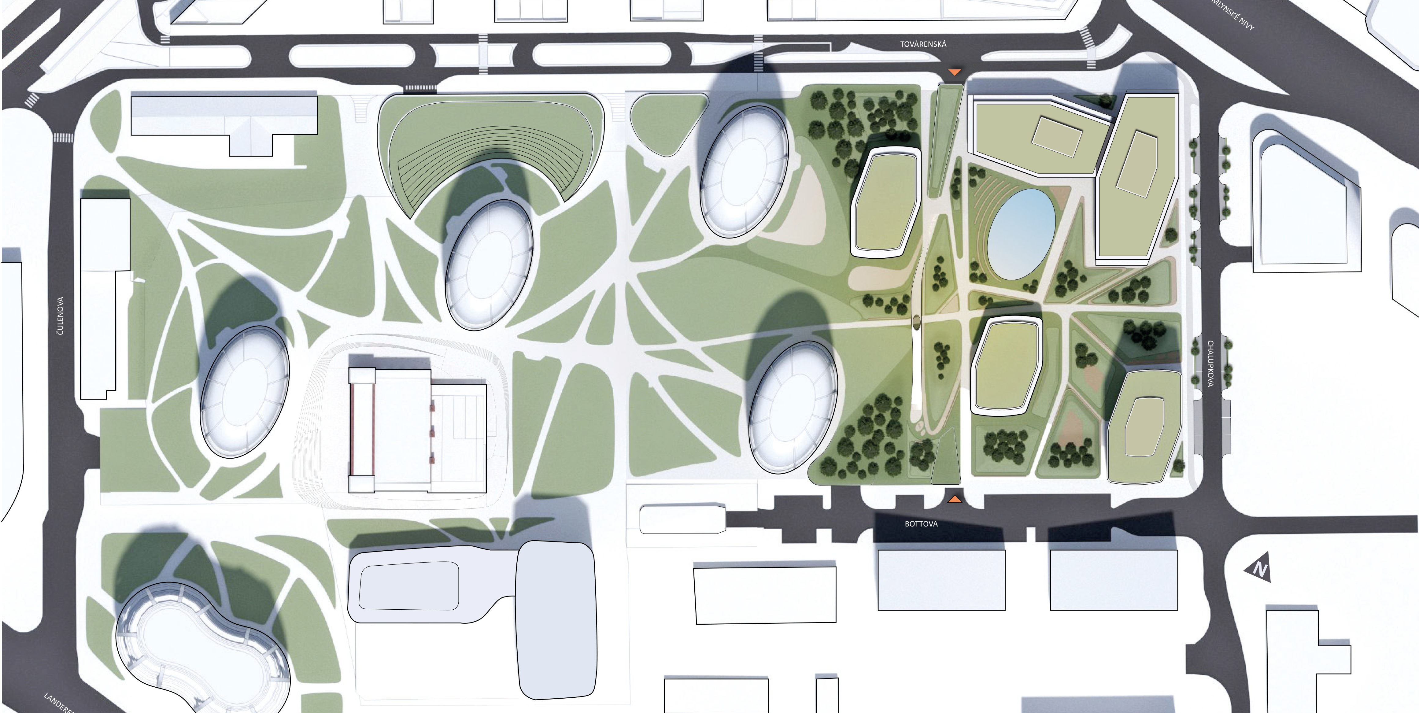 Our shortlisted proposal aimed to enhance the urban landscape by integrating extensive greenery and outdoor amenities, creating a park-like environment within the dense city center. The urban development centers on optimizing space with varied-height point buildings tailored to specific functions. This approach maximizes daylight penetration for both interior spaces and surrounding areas, preserves important vistas—including those leading to the historic city center—and minimizes built-up areas to promote public space at ground level.