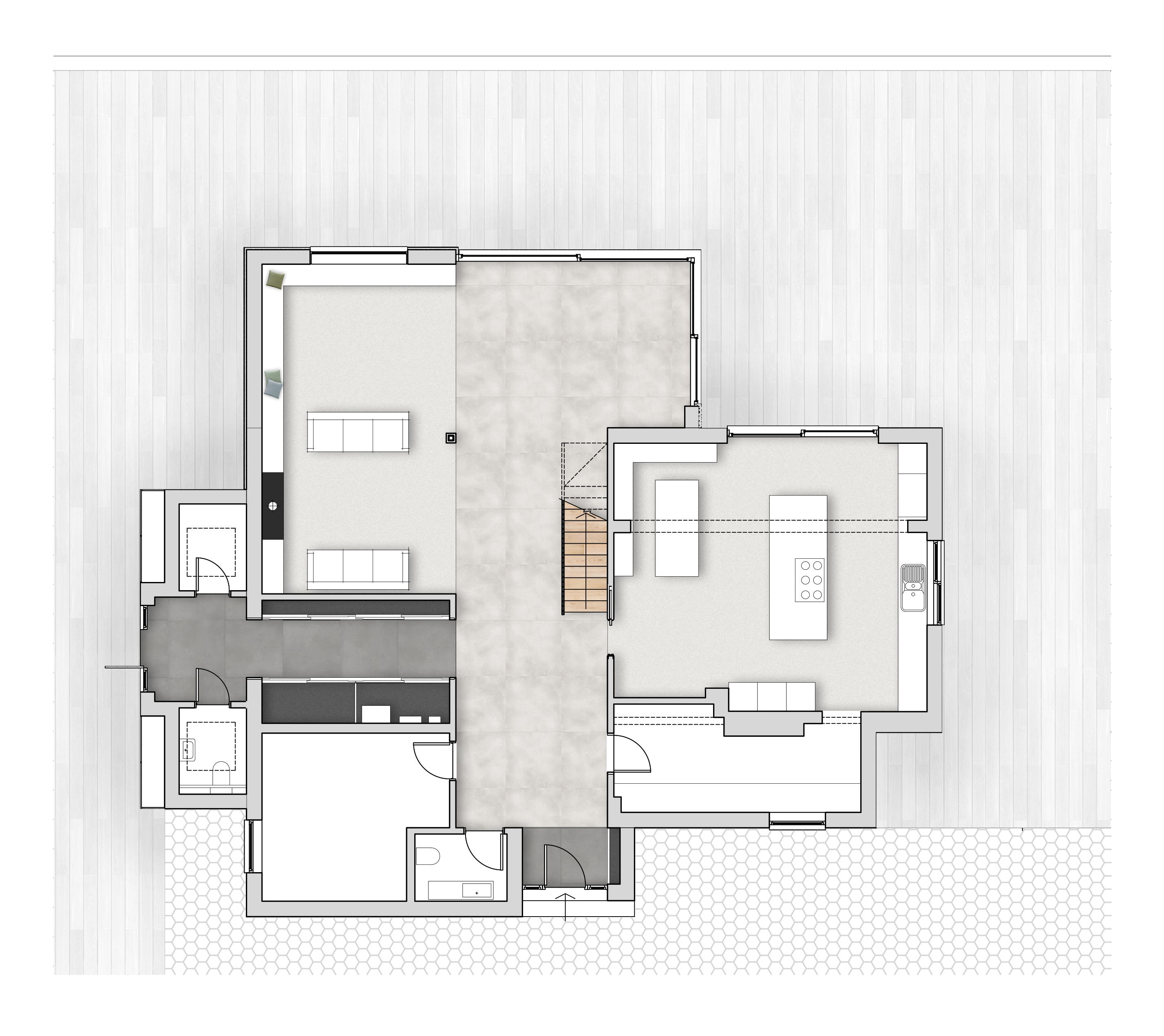 A crucial part of our contribution was developing alternative spatial planning for the large, deep ground-floor space. By rethinking the layout, we introduced a more varied and nuanced use of the space. This included replacing some of the extensive glazed sliding doors with a fixed picture window, which better defined the programmatic use behind it, improved material and structural efficiency, and enhanced the overall spatial experience.
